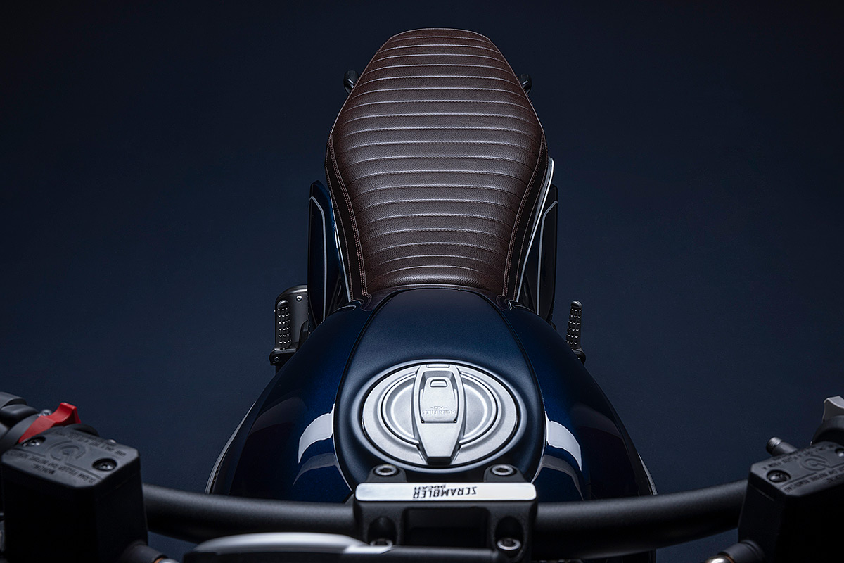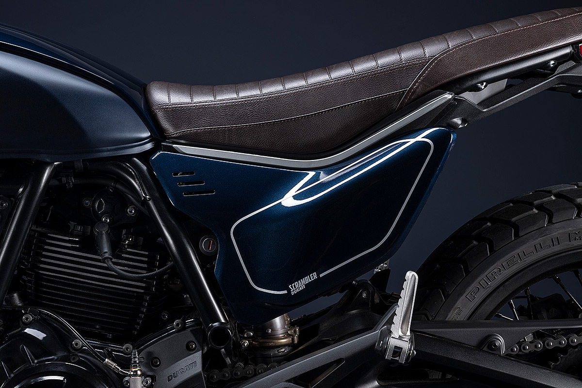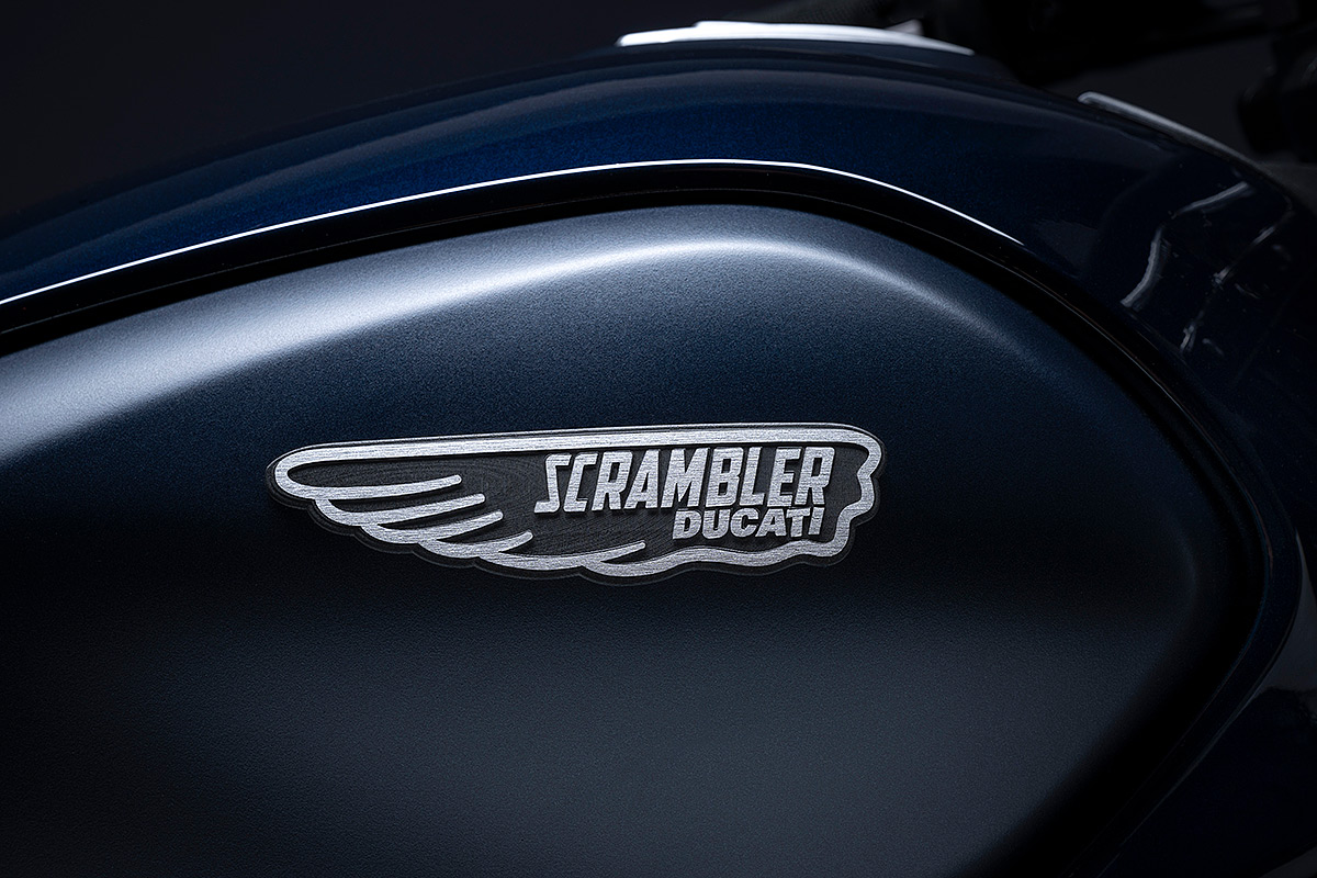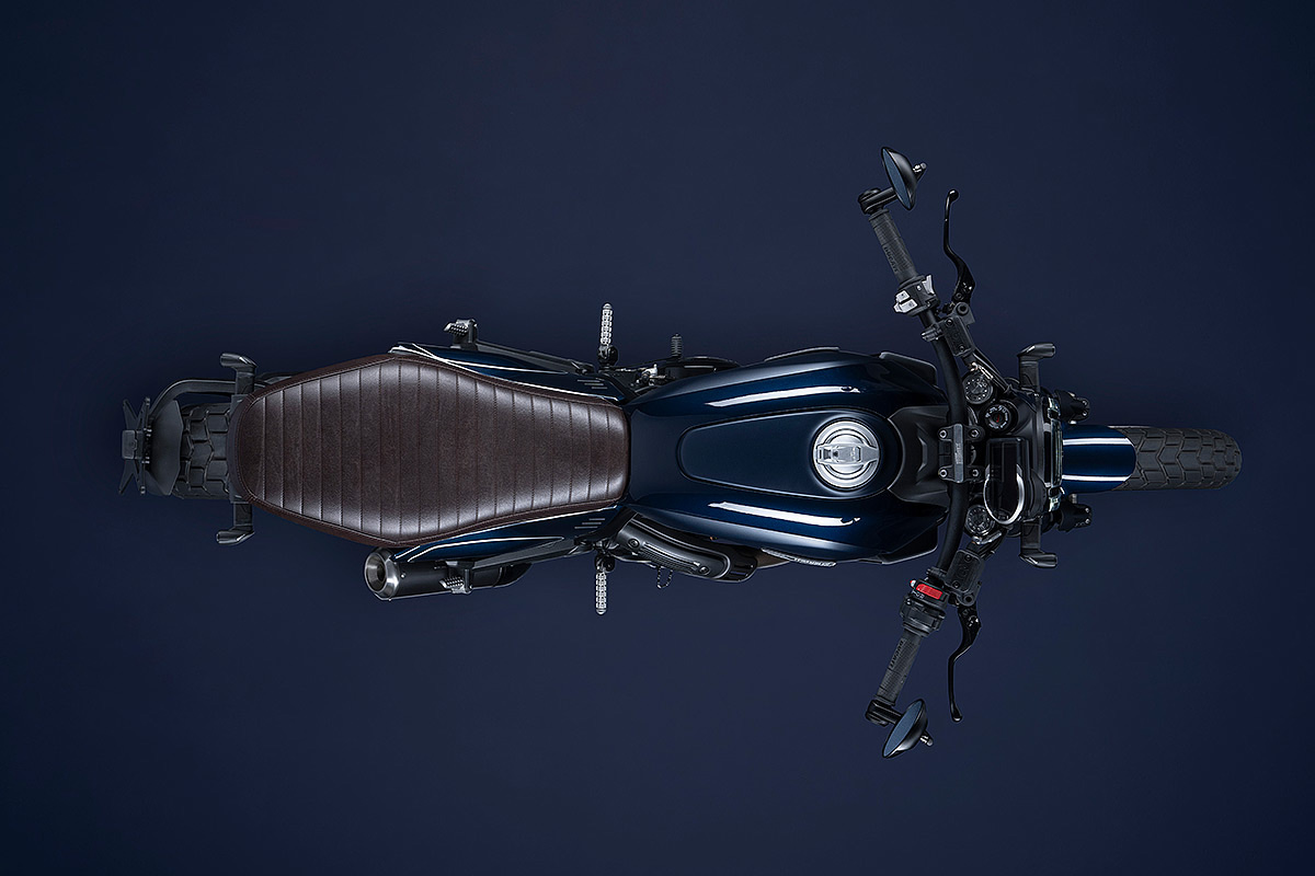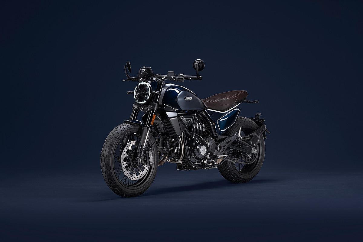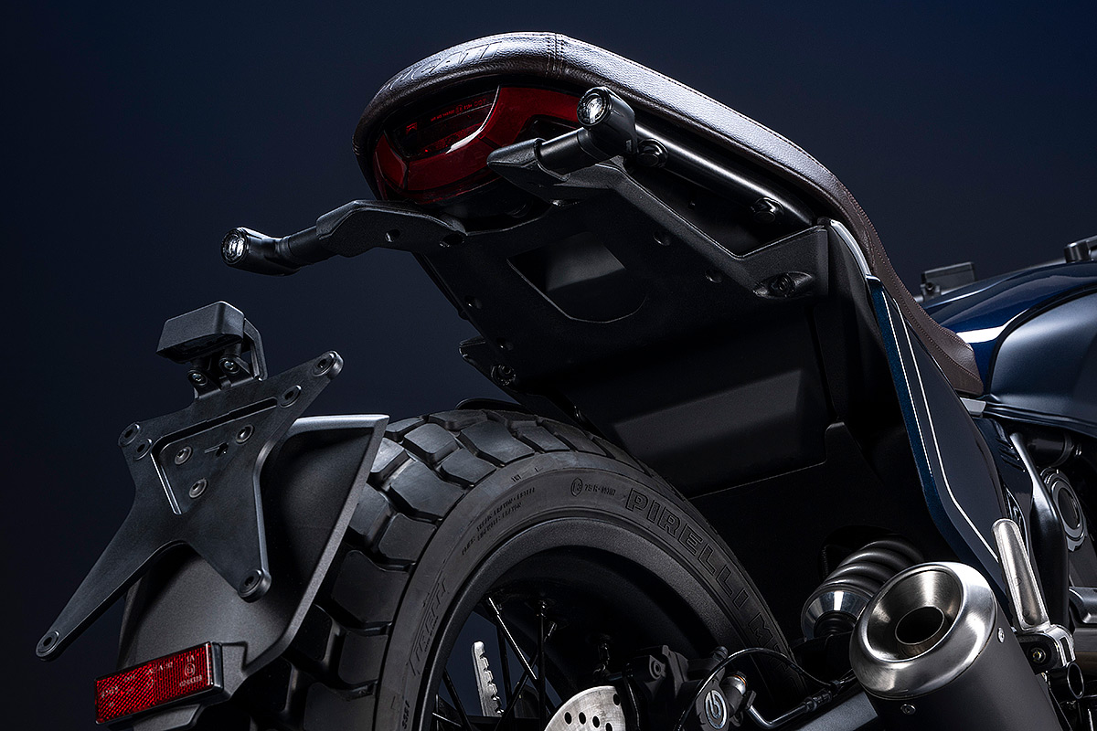 Um die eigene Geschichte neu zu schreiben, muss man manchmal die Vorspultaste drücken. Genau das hat Ducati mit dieser neuen Scrambler Generation getan, die zeitgemäßer, bunter und ein kleines bisschen respektloser ist. Future comes at night. Die neue Generation der Scrambler Nightshift ist da. Ihre elegante Seele umfasst das neue, frische Design der Scrambler Familie mit der eleganten Note eines Street-Racers, ergänzt durch die unverwechselbare Farbe Nebula Blue und die komplett schwarzen Aluminium-Speichenräder, die der Nightshift 2G einen Straßen-Glamour-Look verleihen. Die Sportlichkeit wird durch die am Lenkerstummel außen montierten Rückspiegel, dem niedrigsten Lenker aller Scrambler Modelle, dem kurzen Heck mit den Ducati Performance LED-Blinkern, den Startnummernfelder und dem stylisch kurzen Kotflügel vorne unterstrichen.